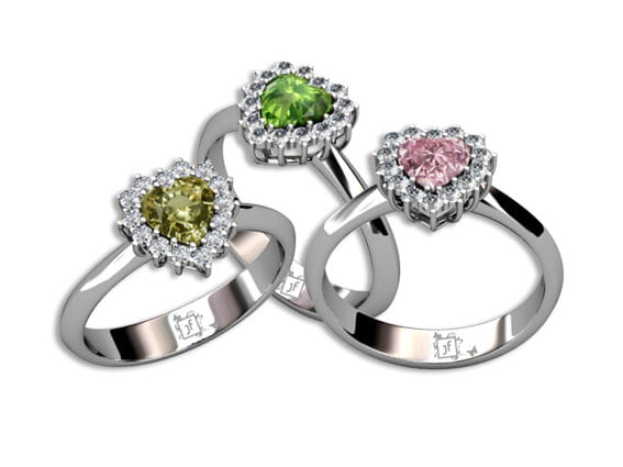 Ringen Lovely tillverkas i 18 k vitguld alternativt rödguld och går att få med en mängd olika färgstenar. Bilden visar exempel med hjärtslipade ädelstenar (ca mått 5,3 x 5,3 mm)