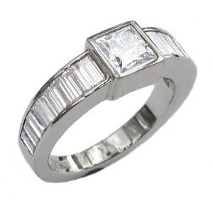 Handsmidd designad ring i Platina med en prinsesslipad diamant infattad samt 16 st baguetteslipade diamanter infattade på sidorna. Totalvikten på diamanterna är ca 1.88 ct, kvalité: Tw,vs