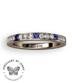 Eternity rings in the pictures is 2.4 mm and the height is 2.3 mm but we also manufacture these rings in other widths and with optional color combinations of gemstones.