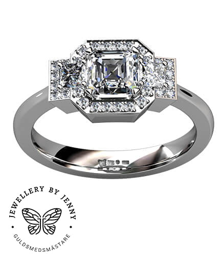 Modellen har tre stycken diamanter som centerstenar som sedan omgärdas av briljantslipade diamanter.