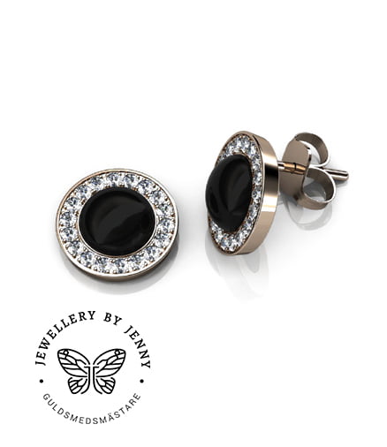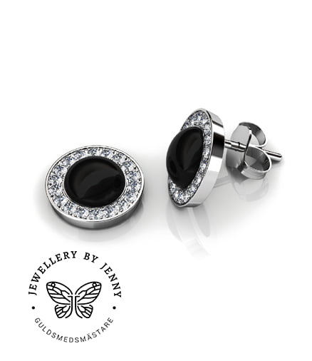 Örhängen med en cabochonslipad onyx i centrum, runt om sitter en krans med briljantslipade diamanter (kvalité tw,vs).