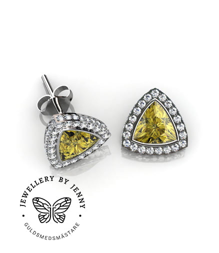 Örhängen i trekantig modell med briljantslipade diamanter och färgstenar, på bilderna ser ni exempel med gula Heliodorer från Vietnam och rosa/lila äkta Zirkoner från Tanzania.