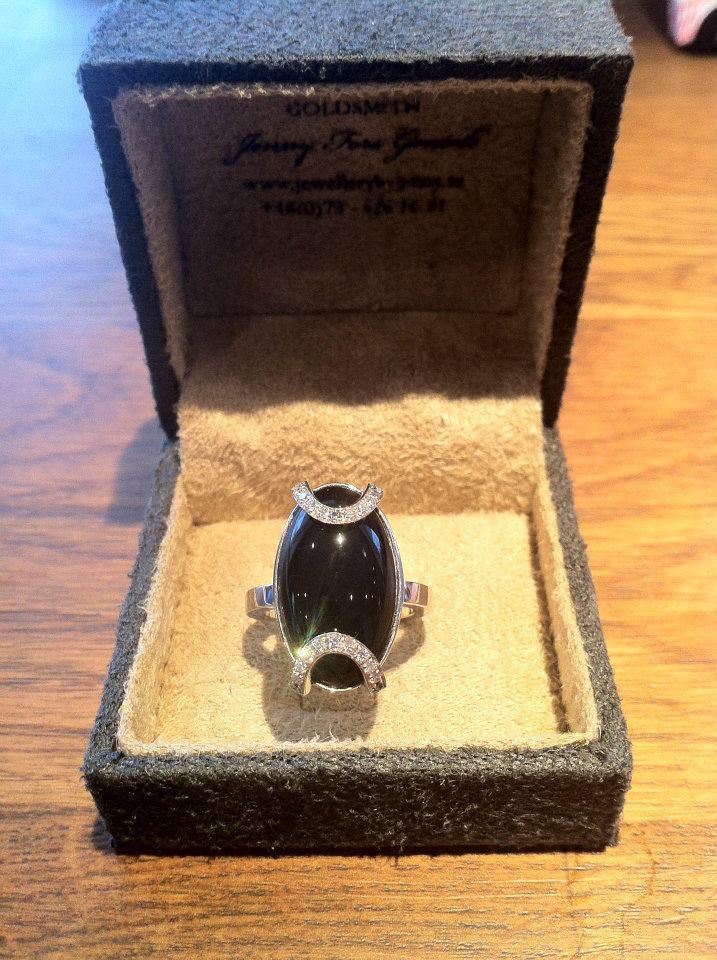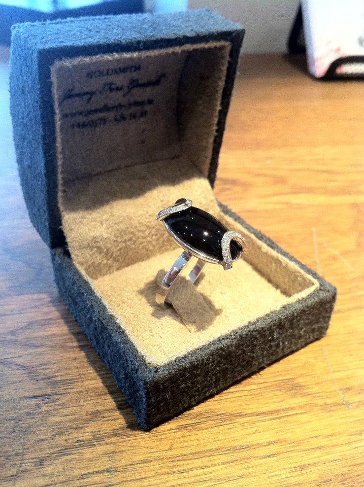 Här är en ring som jag tillverkat åt en kund som jag tycker blev super snygg. Den är tillverkad i 18 k vitguld med en cabochonslipad onyx och två bågar med diamanter.