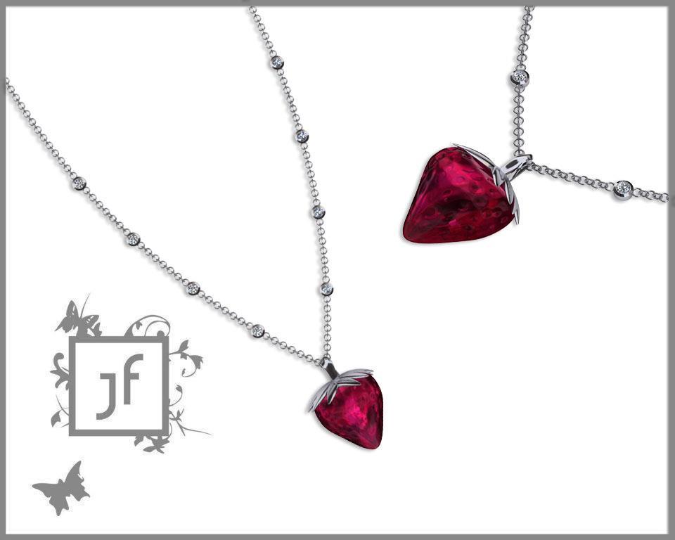 Hängsmycke i form av en jordgubbe tillverkad av 18 k vitguld och specialslipad rhodolitgranat. Kedja även denna i 18 k vitguld med briljantslipade diamanter, denna går även att byta mot annan kedja.